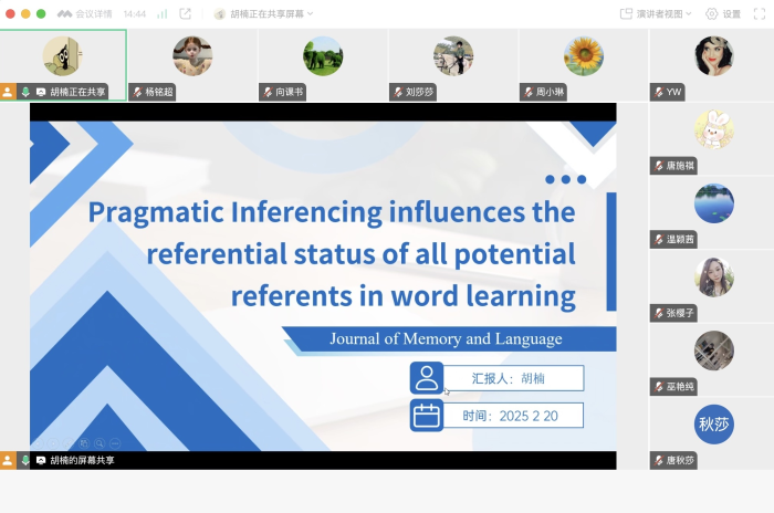 2025年2月20日下午,williamhill官方网站语言认知科学研究团队在线上举行了本年度第一次科研例会。本次科研例会主要围绕“语用层面的词汇学习”及“R语言基础知识学习及数据可视化”两部分展开,分别由胡楠博士和23级翻译专业硕士生杨铭超同学进行汇报。本次例会由团队负责人向课书博士主持,语言认知科学研究团队主要成员及部分硕士生参加了本次例会。