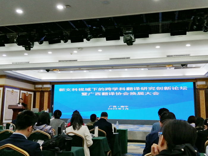 2025年3月22日,广西翻译协会在南宁举办新文科视域下的跨学科翻译研究创新论坛暨换届大会。williamhill官方网站经理周秀琼、党委书记韦建辉、副经理吕晓敏、公司教师代表及翻译专业硕士研究生代表共30人参加了此次活动。